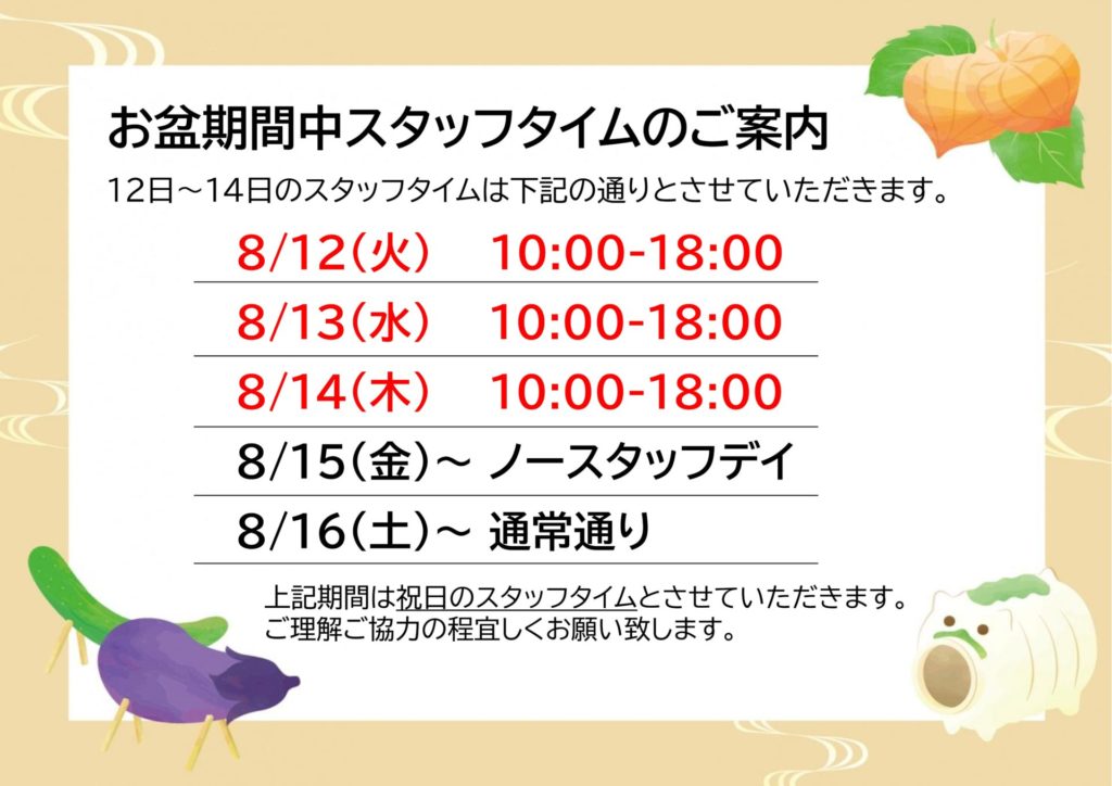 お盆期間中のスタッフタイムは、下記の通り変更となります。