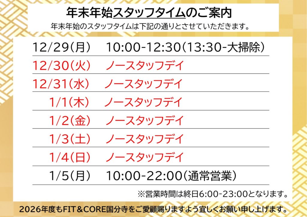 年末年始のスタッフタイムにつきまして、下記の通りご案内いたします。