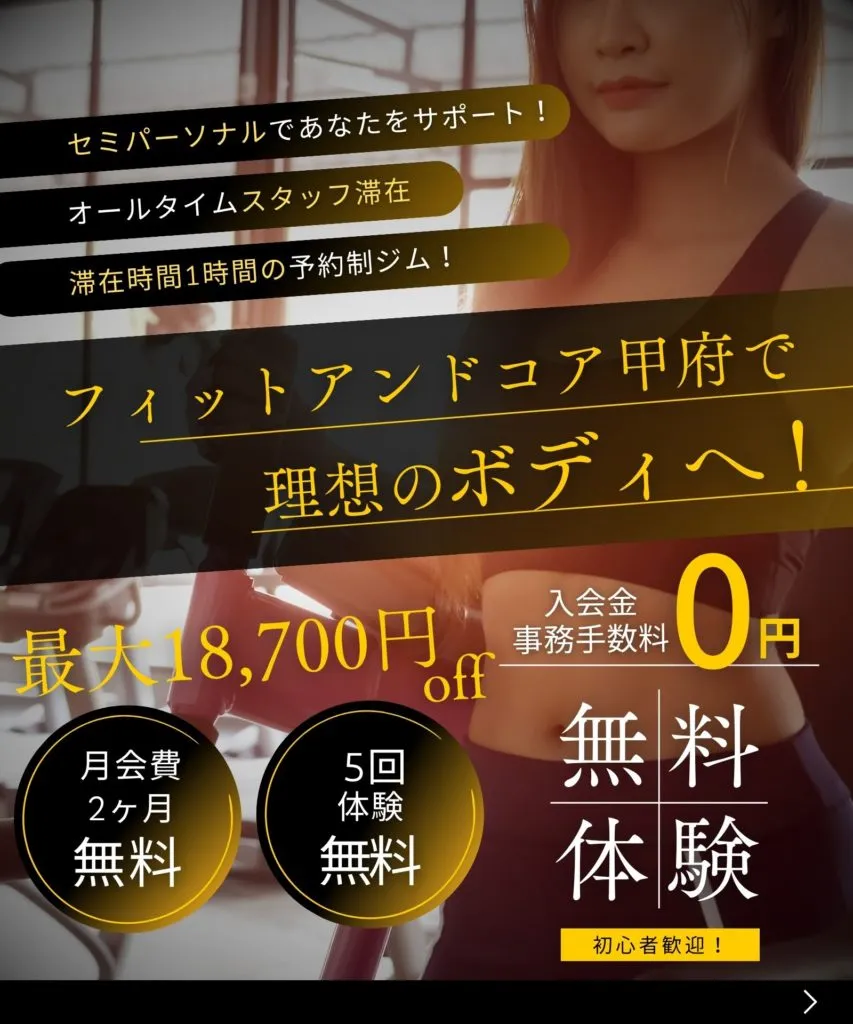 フィットアンドコア甲府は、甲府市に位置するフィットネスジムです。当施設では、経験豊富なスタッフが、お客様一人ひとりの健康的なライフスタイルの実現をサポートします。初心者から上級者まで、それぞれのニーズに合わせた多彩なトレーニングプログラムを提供しております。最新の設備と専門知識を備えたトレーナーが、お客様の目標達成をきめ細かくバックアップいたします。地域の皆様にとって、新しいフィットネスの選択肢として、ぜひフィットアンドコア甲府をご利用ください。お客様の健康と美容の向上に貢献できるよう、スタッフ一同心よりお待ちしております。